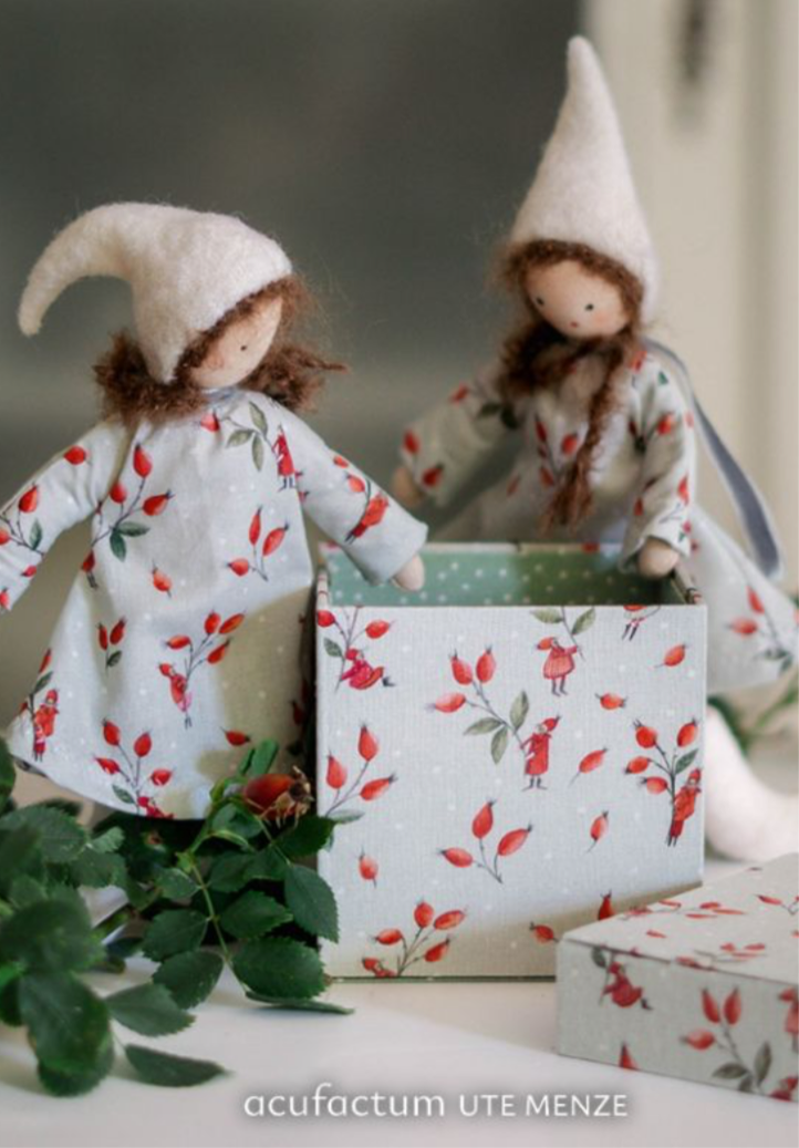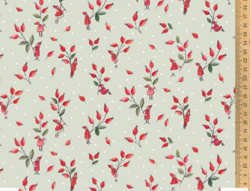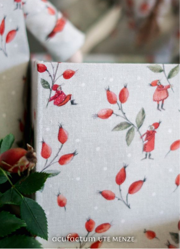 „Der Baumwollstoff Hagebuttentanz zeigt kleine Wichtel, die sich spielerisch zwischen leuchtend roten Hagebuttenzweigen bewegen. In fröhlichen Kleidern und roten Mäntelchen tanzen und klettern sie zwischen den Zweigen umher, als seien die Früchte ihre kostbaren Schätze. Der zarte, helle Grundton unterstreicht die warmen Rottöne und verleiht dem Stoff eine heitere Leichtigkeit, die an winterliche Spaziergänge erinnert.