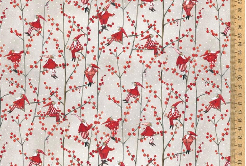„Der Baumwollstoff Ilexwichtel entführt in eine zauberhafte Winterlandschaft, in der kleine Wichtel zwischen roten Ilexbeeren und zarten Zweigen herumturnen. In rot-weiß gemusterten Gewändern und mit langen Zipfelmützen klettern und balancieren sie geschickt zwischen den Beeren, als würden sie mitten in einem geheimen Fest voller Freude und Spielerei leben. Der helle, winterliche Hintergrund mit sanft fallenden Schneeflocken unterstreicht die Leuchtkraft der roten Details und bringt die Figuren besonders schön zur Geltung.